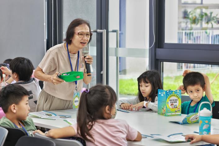 「淨零綠生活營」則由新北市中園國小輔導主任梁哲霖與臺南市環保局環教志工謝蘇美蓮帶領,以「讓淨零科技融入日常生活」為題,透過故事與遊戲引導孩子了解能源轉換與綠能應用,並親手製作太陽能電動風扇,體驗太陽能轉換電力的原理,從實作中感受綠色科技魅力。