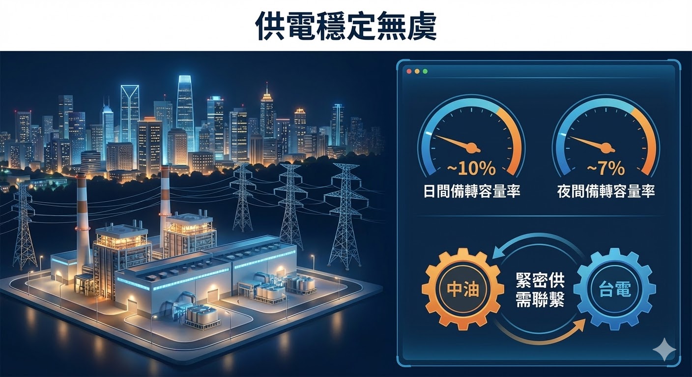 經濟部進一步說明,中油與台電公司之間建立了緊密供需聯繫及預警機制,能即時掌握市場需求變化。台電各發電機組均依既定排程操作,天然氣發電量未降低,並已備妥包括強化機組運轉維護、合理調度水力機組及需求面管理措施等應變方案。經濟部預估,今年上半年日間備轉容量率可維持約10%,夜間備轉容量率約7%,可確保供電穩定。