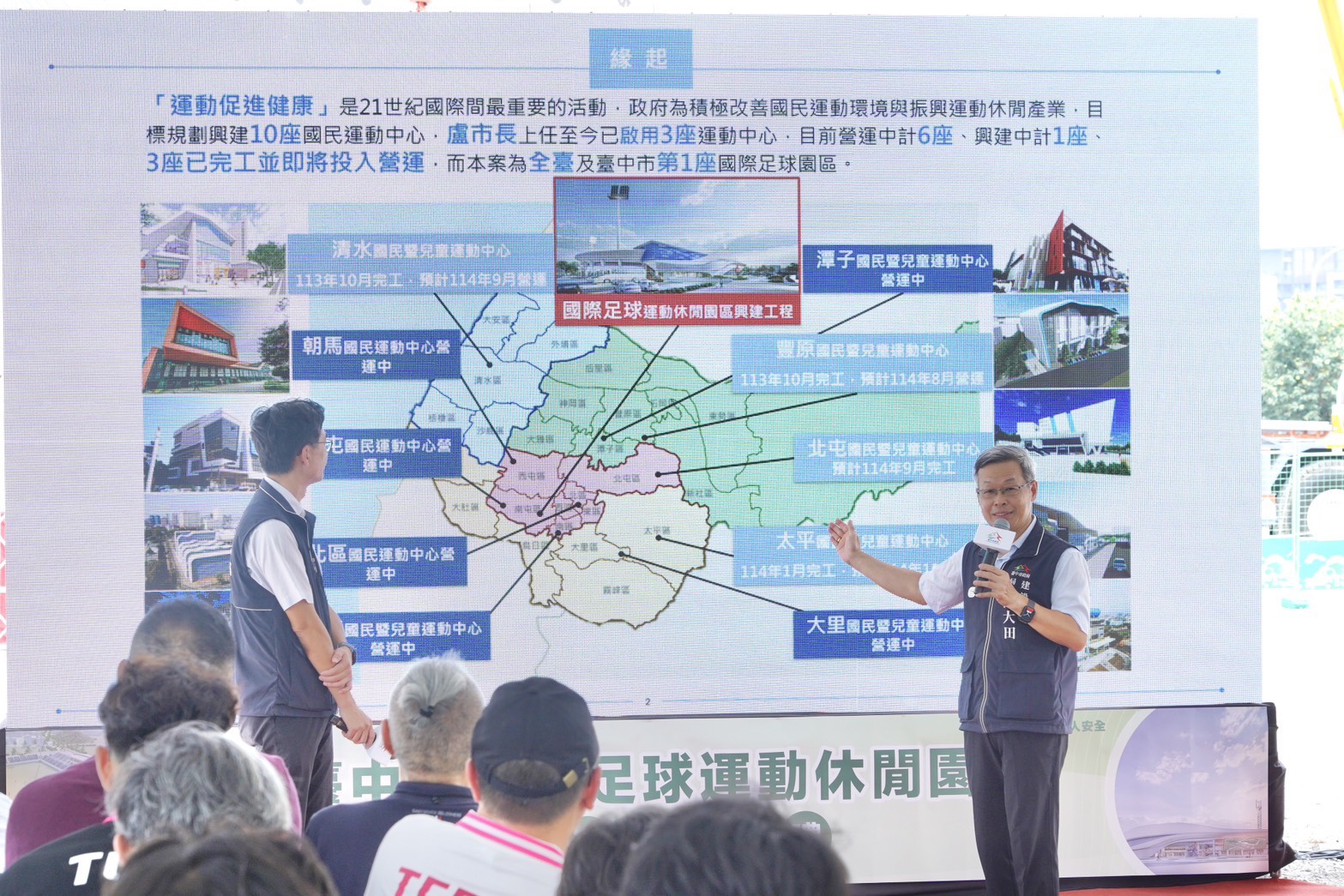 臺中市長盧秀燕推動「酷城市、酷運動」政策,強調打造國際級運動設施,全面提升市民運動參與與城市國際能見度。建設局長陳大田指出,感謝中央體育署挹注5億元補助,立法院副院長江啟臣與立委楊瓊瓔、廖偉翔協助爭取,市府自籌10億元經費,在議會支持下得以推動重大運動建設。