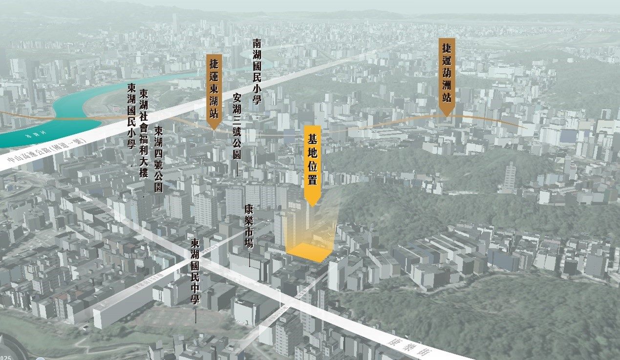 基地鄰近東湖國中、五分埤生態濕地,5分鐘車程內可達捷運東湖站與內湖國小,生活機能完善。更新後的規劃將取得建築能效1plus,並加強結構安全、耐候減碳、都市減災與環境友善,目標打造安全宜居、兼顧生態的住宅社區。