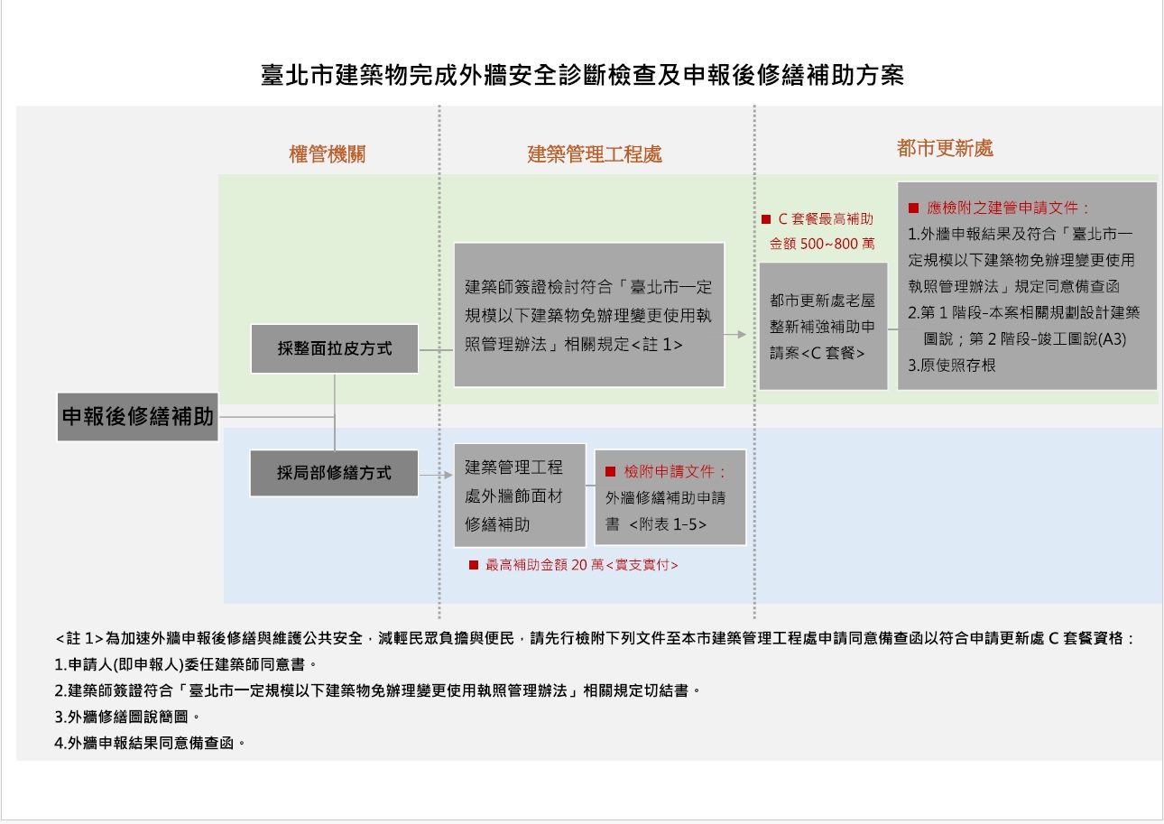 建管處已新增「臺北市建築物完成外牆安全診斷檢查及申報後修繕補助方案流程圖」,民眾可至建管處網站(http://dba.gov.taipei)「科室業務-使用科-建物外牆飾面剝落修繕及安全申報建物外牆安全」查詢申請流程。