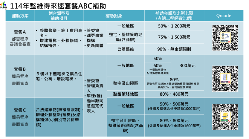 為協助屋齡較高且已完成外牆診斷檢查及申報的建築物進行修繕,臺北市政府建管處表示,民眾可銜接都市更新處「老屋整新補強補助申請案」(C套餐),減輕住戶龐大修繕費用負擔,並提升申請便利性與建築物安全。