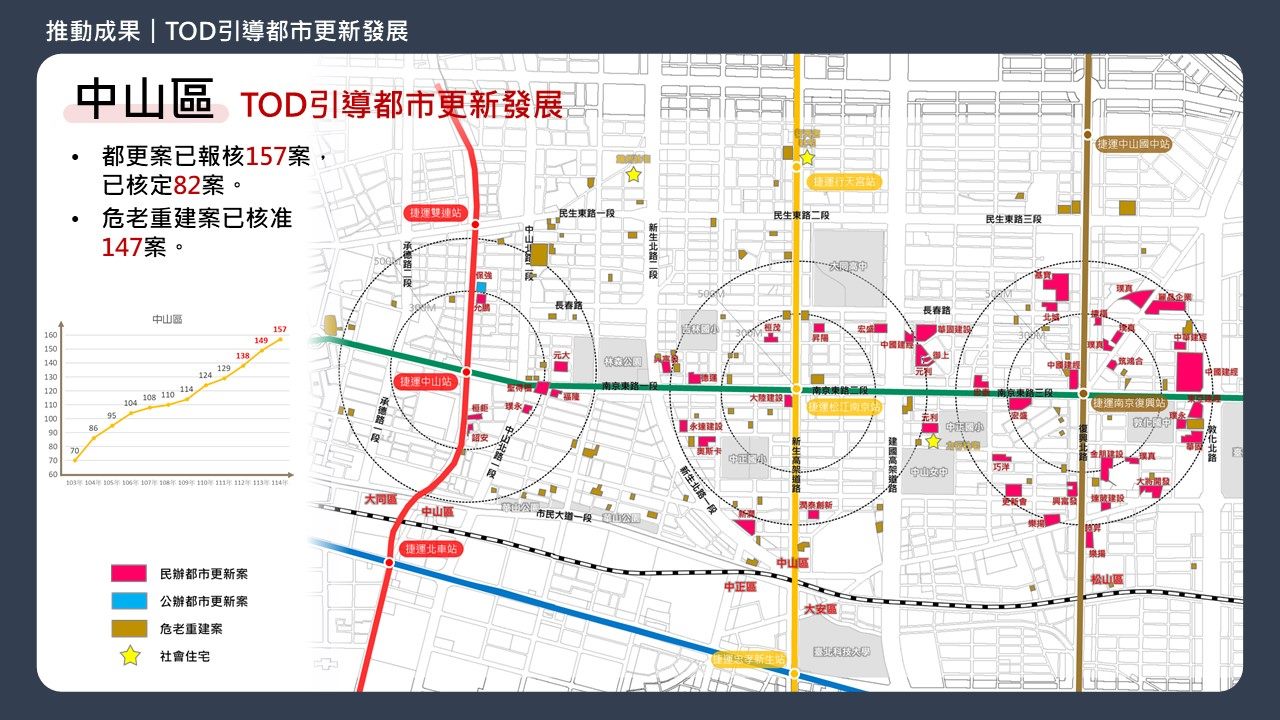在區域發展上,西區台北車站周邊公私開發案件齊發,大同區年均報核量是過去八年的3.3倍,逐步塑造臺北門戶嶄新面貌;南港產專區由傳統工業轉型為現代化創新產業基地,累計都更面積高達45公頃;萬華區報核量為過去八年的兩倍,顯示都更動能持續升溫。受市府TOD政策推動,中山區捷運場站周邊更新亦加速,危老與都更核准量均為全市最多,展現臺北東西軸帶、新舊市區同步發展的成果。