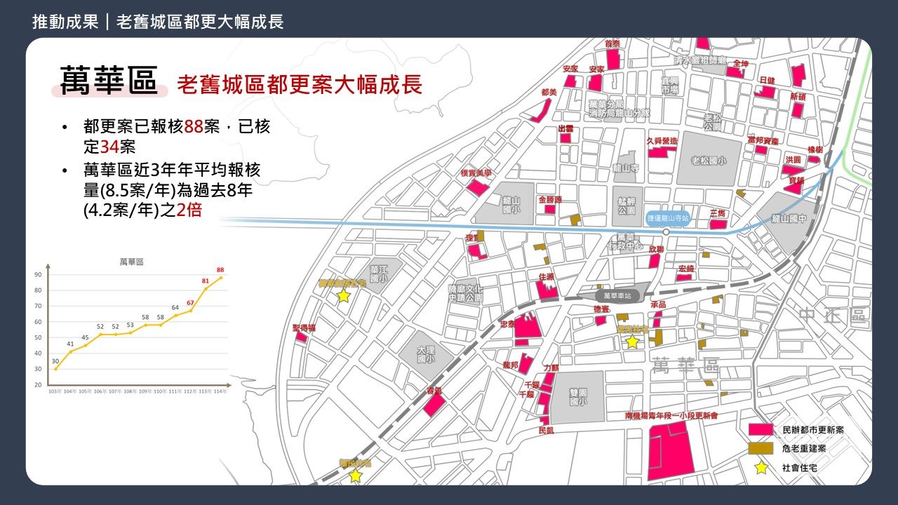 都市更新處指出,近三年都更重建報核案件353案,審議程序簡化、專人控管,100%同意案可加速重建,民眾可切身感受到老舊社區快速換新、安居環境改善。公辦都更PRO自112年起啟動39案、完工6案,整宅計畫推動順利,包括水源二三期、南機場單元三及斯文里二期等項目已完成招商簽約,信維整宅第三階段模擬選配已達九成門檻,吳興二期半世紀老宅也於114年11月開工,市府持續陪伴住戶完成整宅重建。