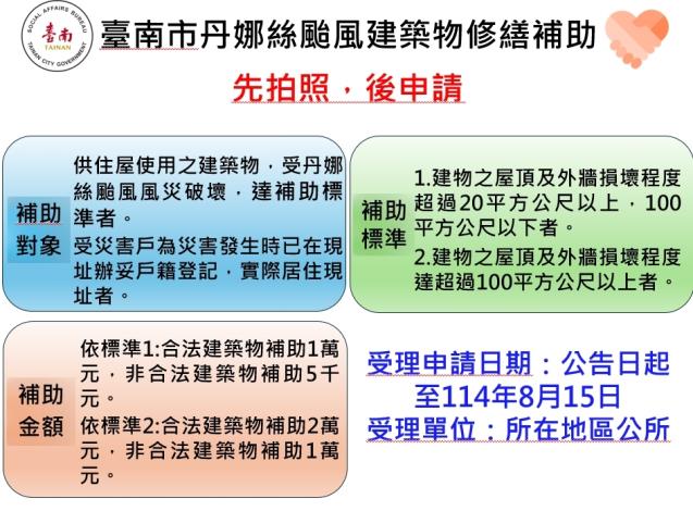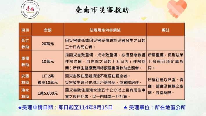 為協助民眾迅速重建家園,臺南市政府10日宣布「丹娜絲颱風災損補助方案」,自即日起至8月15日止,受災民眾可向各區公所提出申請。補助項目涵蓋死亡、重傷、住宅毀損、淹水及車輛損壞等六大類,最高可領20萬元。