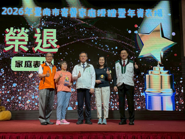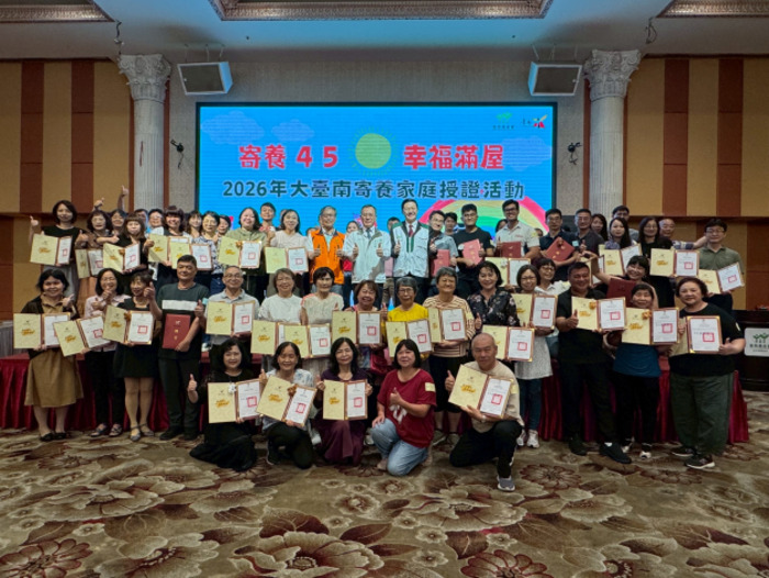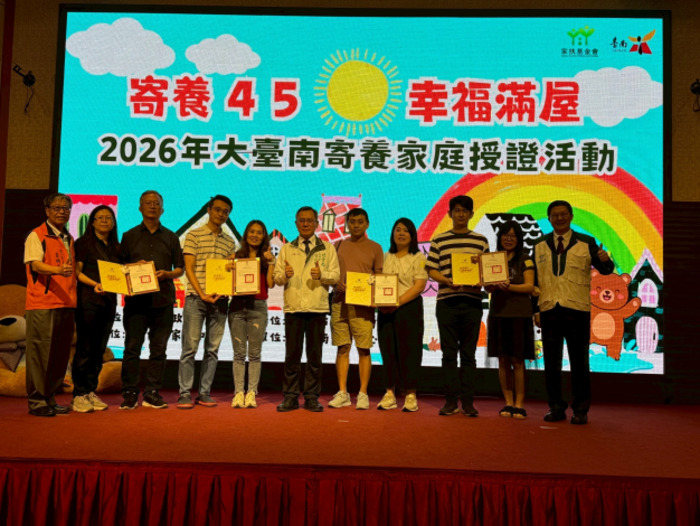 臺南市政府為感謝寄養家庭長期投入兒少照顧工作,今(18)日由社會局與北、南臺南家扶中心共同舉辦「寄養45‧幸福滿屋—2026年臺南市寄養家庭授證活動」,由社會局葉誌明副局長代表臺南市長黃偉哲出席,頒發81戶寄養家庭合格證書,並表揚服務滿30年、20年、15年、10年及5年之寄養家庭共14戶,肯定其長期守護兒少的貢獻。