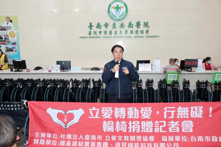 為提升醫療院所服務效能並照顧行動不便民眾就醫需求,立愛文教關懷協會攜手國產建材實業集團,捐贈130張輪椅予臺南市4家急救責任醫院,18日上午於安南醫院醫療大樓1樓大廳舉行捐贈儀式。臺南市長黃偉哲親自出席見證並頒發感謝狀,肯定民間團體長期投入公益,攜手市府打造更友善的醫療環境。