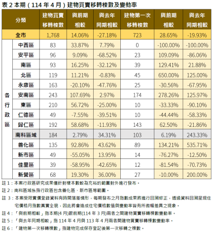 交易量方面,全市建物買賣移轉共計1,768棟,安南區交易量年增107.69%,善化區因新建案完工,第一次移轉棟數達89棟,年增92.86%。歸仁、新營及南科區也有成長。反觀安平、永康及佳里區交易量較去年同期跌逾四成。