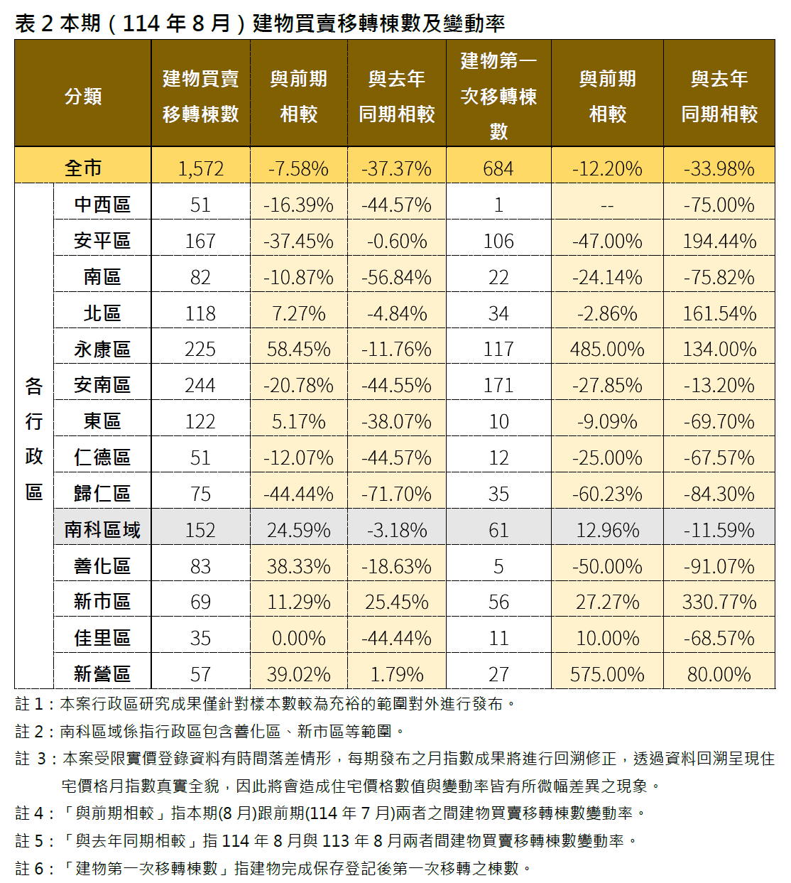 本期全市交易量為1,572棟,較7月減少7.58%,與去年同期相比大幅衰退37.37%。其中,永康區交易量年增58.45%,新營區增加39.02%,成為亮點。交易量前三名行政區分別為安南區(244棟)、永康區(225棟)、安平區(167棟)。新市區受新建案完工影響,本期交易量較去年同期增加25.45%,而歸仁區與南區交易量均下跌逾五成。