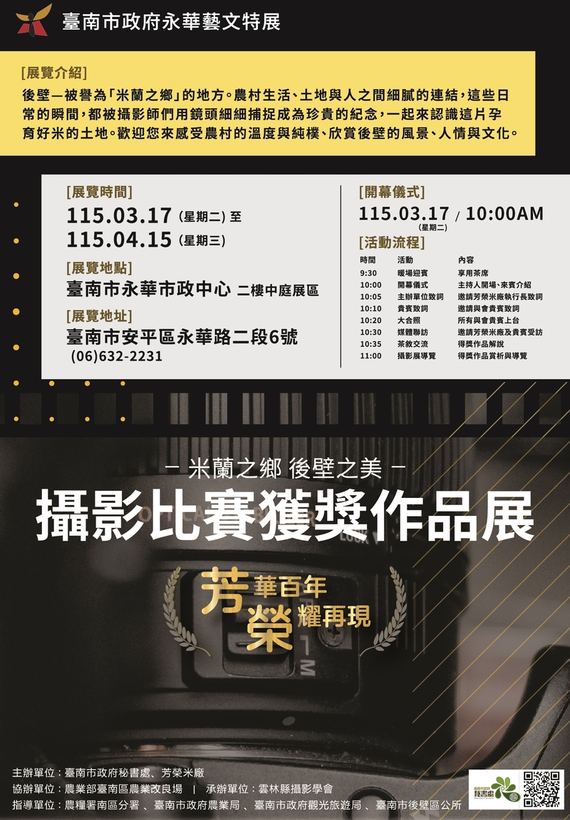 開幕活動中,芳榮米廠也準備了在地特色米食,包括無米樂香米餅、無米樂微波飯及長短樹碗粿,與現場民眾共享後壁米鄉的美味。市府誠摯邀請市民朋友前往觀展,透過鏡頭走進後壁、看見後壁,體驗農村文化與土地故事交織的動人風景。