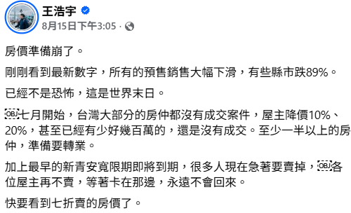 民進黨前桃園市議員王浩宇在社群媒體直言,根據他掌握的數據,全臺多數縣市的預售屋銷售量大幅衰退,有些縣市下滑近九成。他指出,許多屋主即便降價 10% 至 20%,甚至調降數百萬元,仍無法成交,「至少一半以上的房仲準備轉業」。