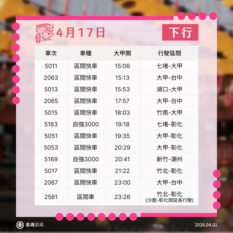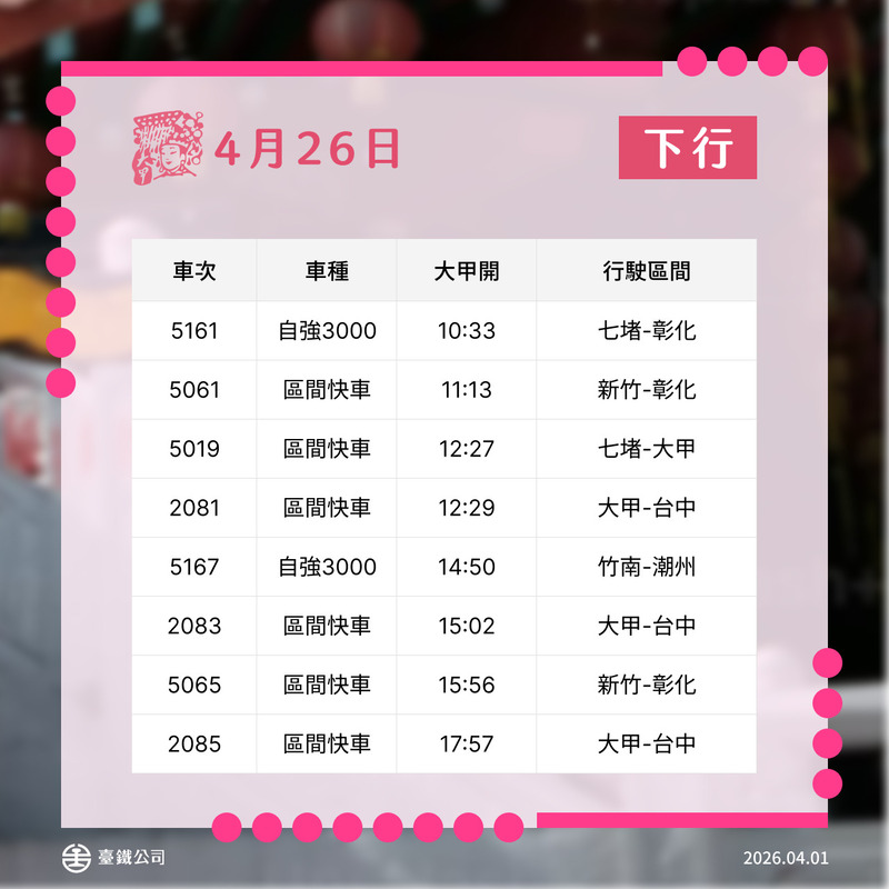 因應年度宗教盛事「2026大甲媽祖遶境進香活動」帶動龐大人潮,臺鐵公司宣布將於115年4月17日及26日兩天加強運輸調度,規劃加開自強號及區間快車共計38列次,並同步加掛車廂,以提升整體疏運效率。