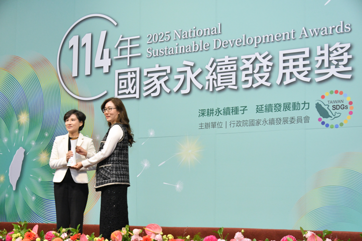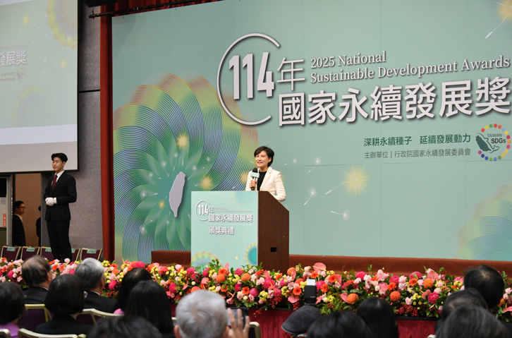 她表示,本屆得獎團隊展現跨領域的永續創新,包括將SDGs納入校務規劃的大學、推動低碳供應鏈的大企業、深耕循環經濟的中小企業、導入轉型金融的金融機構,以及在公共工程融入節能與環境理念的政府機關等,皆具示範效果。