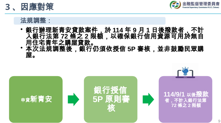 行政院長卓榮泰今(4)日於行政院會聽取金融監督管理委員會「新青安.貸的到-配合青年安心成家購屋優惠貸款精進方案之調整」報告時宣布,自9月1日起,銀行辦理新青安貸款的撥款案件,將不再計入《銀行法》第72條之2規定的比率限額,以協助青年優先取得自住房屋貸款,並兼顧銀行風險控管,推動房市健全發展。