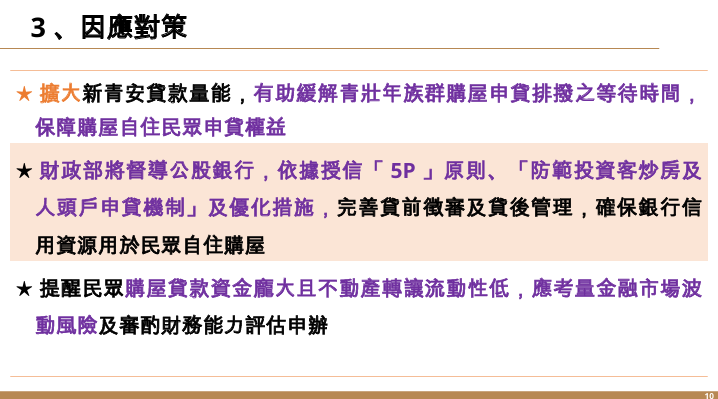 他並責成財政部及金管會,持續督導公股銀行依循金融主管機關徵授信規範及中央銀行不動產信用管制規定辦理,嚴格查核轉租、人頭戶與營業性質的不當貸款,杜絕投機操作,確保銀行信用資源用於支持民眾自住購屋。