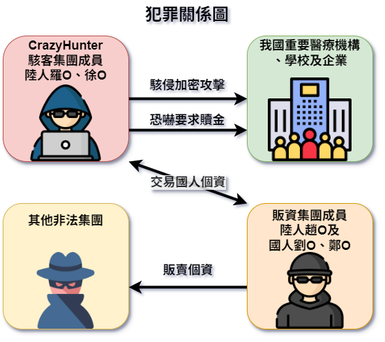 經科技偵蒐查,調查局掌握證據顯示,CrazyHunter集團將駭入的國人個資販售給不法集團。駭客成員包括陸籍羅男與徐男;販售個資的成員則有陸籍趙男,以及國人劉男、鄭男。犯罪關係網絡清楚呈現駭客與販資行為的鏈結。