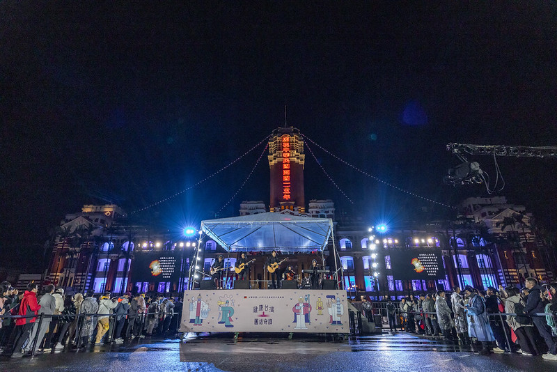 典禮中,在四大醫護公會代表及極地超馬選手陳彥博領唱下,總統、副總統與現場民眾齊唱國歌,隨後國旗在國旗歌樂聲中冉冉升起,場面莊嚴隆重。升旗典禮結束後,總統與副總統步上舞台向參與人員揮手致意,感謝醫護人員長年站在守護國人健康的第一線,並期盼新的一年全體國民持續團結,共同守護臺灣的健康與安全。