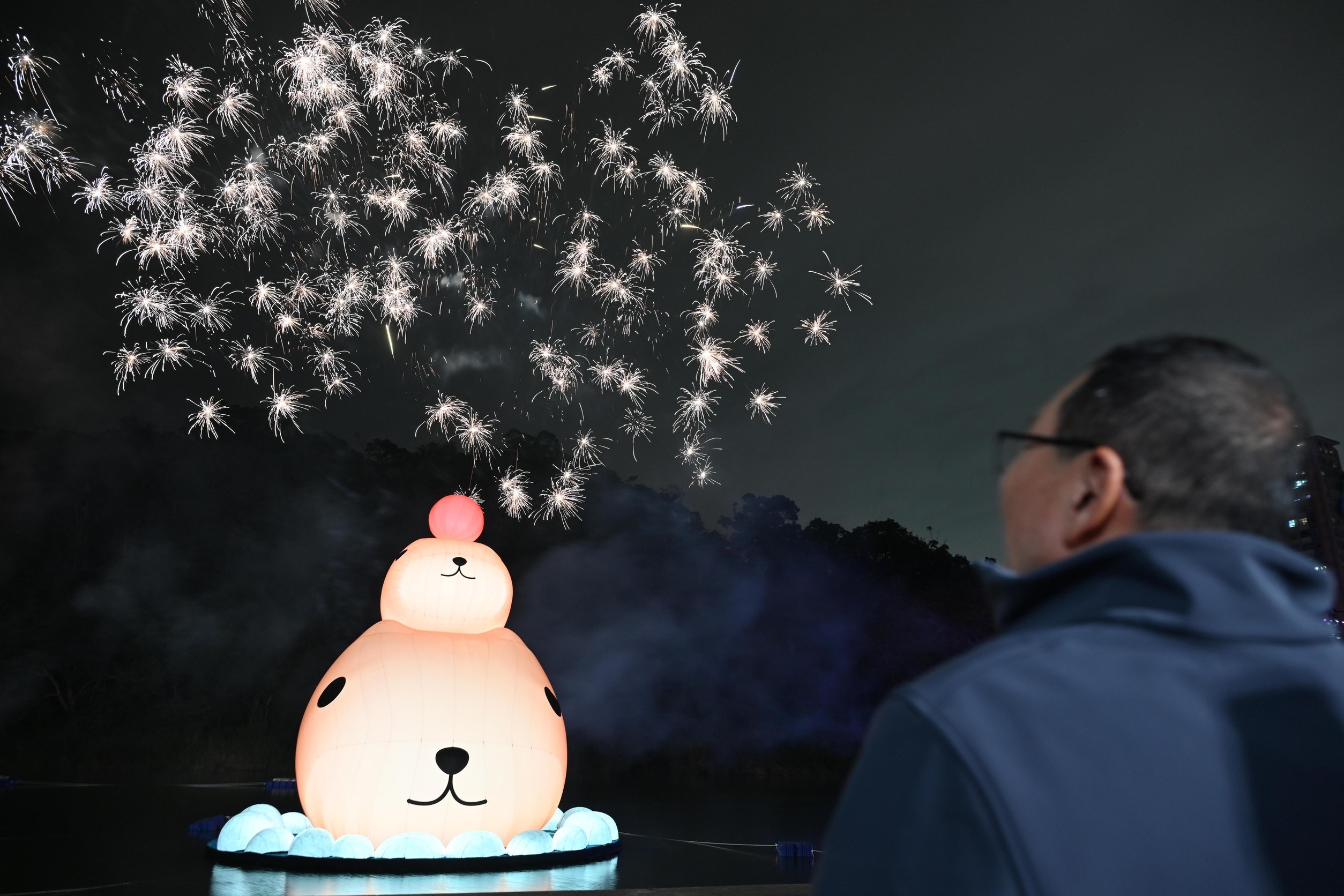 新北市政府觀光旅遊局今(1)日晚間於碧潭風景特定區東岸廣場舉辦「呆在碧潭の水豚君」地景裝置展,活動由市長侯友宜揭幕並啟動開幕煙火秀。此次與日本人氣 IP「水豚君」合作,打造高達12公尺的水上大型裝置藝術,展期自即日起至12月28日止,為期58天。