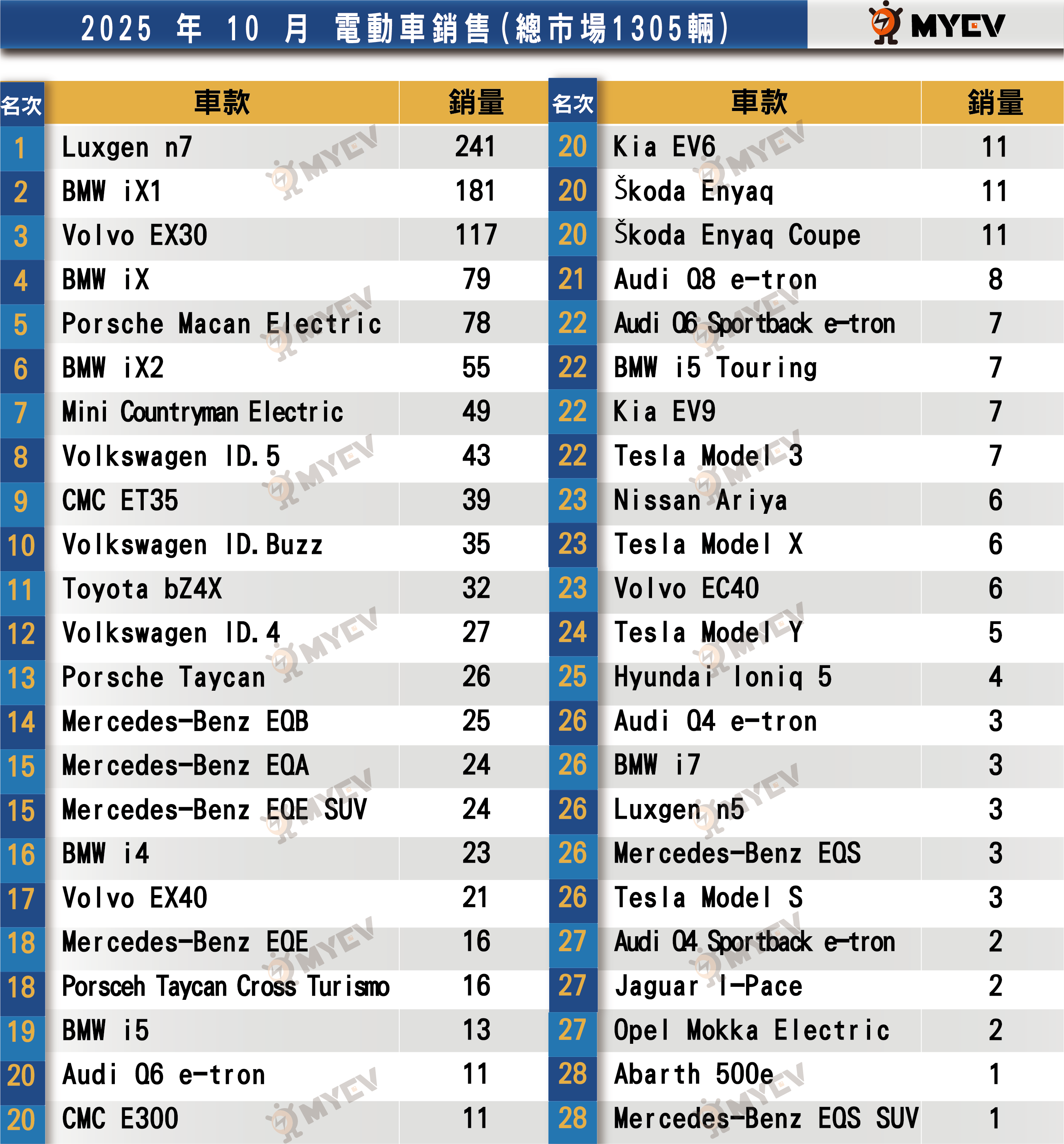 雖然Tesla因船期影響,10月掛牌僅 21輛,遠低於9月的2,491輛,但其他品牌的穩定表現成功撐起整體市場,使總銷售量依然維持正成長。