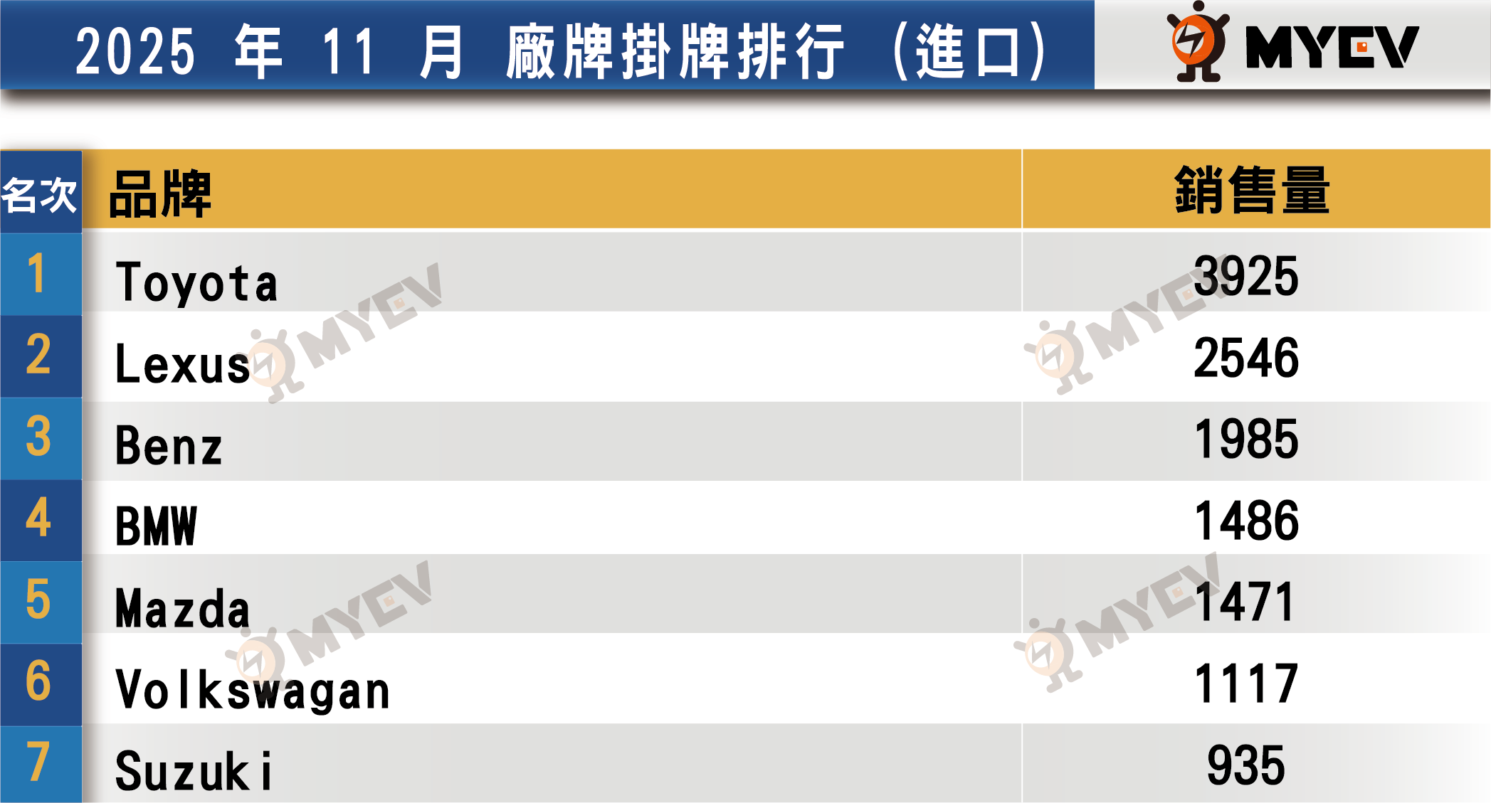 11月份進口車總市場掛牌18,124輛,月增18%,但較去年同期衰退約5.8%。Toyota以RAV4及Camry等主力車款領牌3,925輛,月增45.6%,累積銷售仍居冠。Lexus累積至11月銷售26,824輛,較2024年同期微幅提升0.9%,Kia亦有2.8%成長。