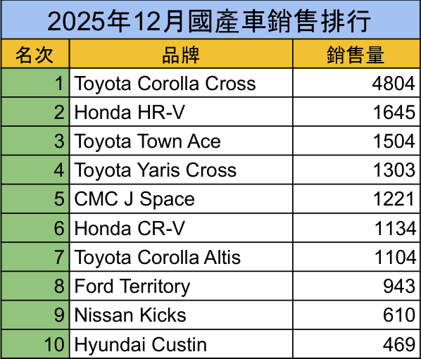 主力銷售集中於中小型休旅與高CP值車款,其中 Toyota 旗下 Corolla Cross 持續領跑國產市場,12月登錄 4,804 輛,全年累計達 44,800 輛,不僅刷新歷史銷售紀錄,也完成全市場全車種銷售五連霸,顯示家庭用車族群仍以價格穩定、妥善率與保值性為主要考量。