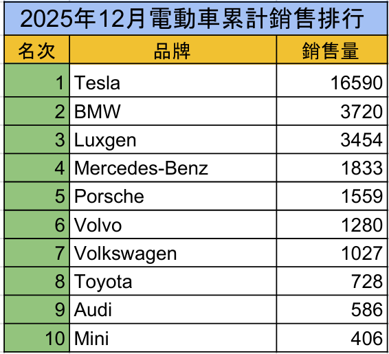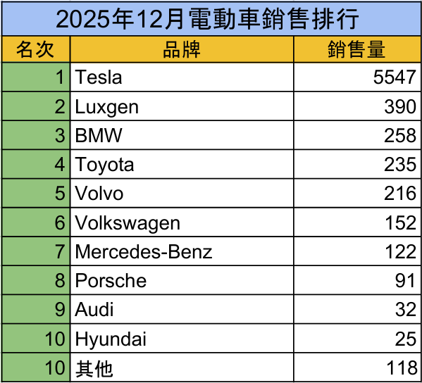 Tesla 受惠 Model Y 大量到港交付,12月登錄數衝高至 5,547 輛,不僅推升單月電動車占比,也使其成為2025年主要豪華品牌中,少數全年未出現衰退者之一。