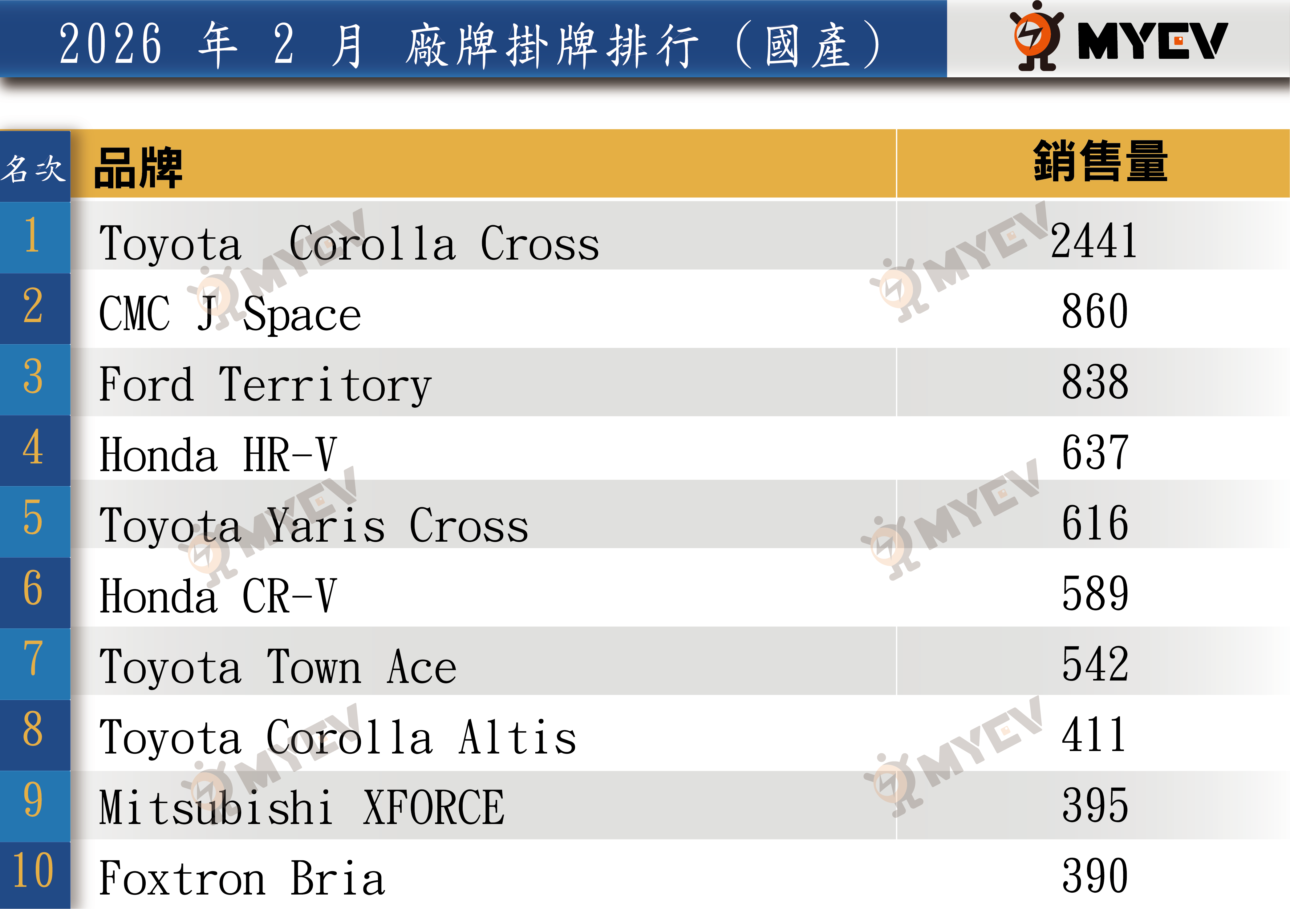 2月國產車市場在總量縮減下仍維持相對穩定格局。Foxtron以Bria車系(Model B)單月390輛掛牌成績首度擠進前十,與Mitsubishi XForce差距僅個位數,顯示新品牌開始在主流級距站穩腳步。