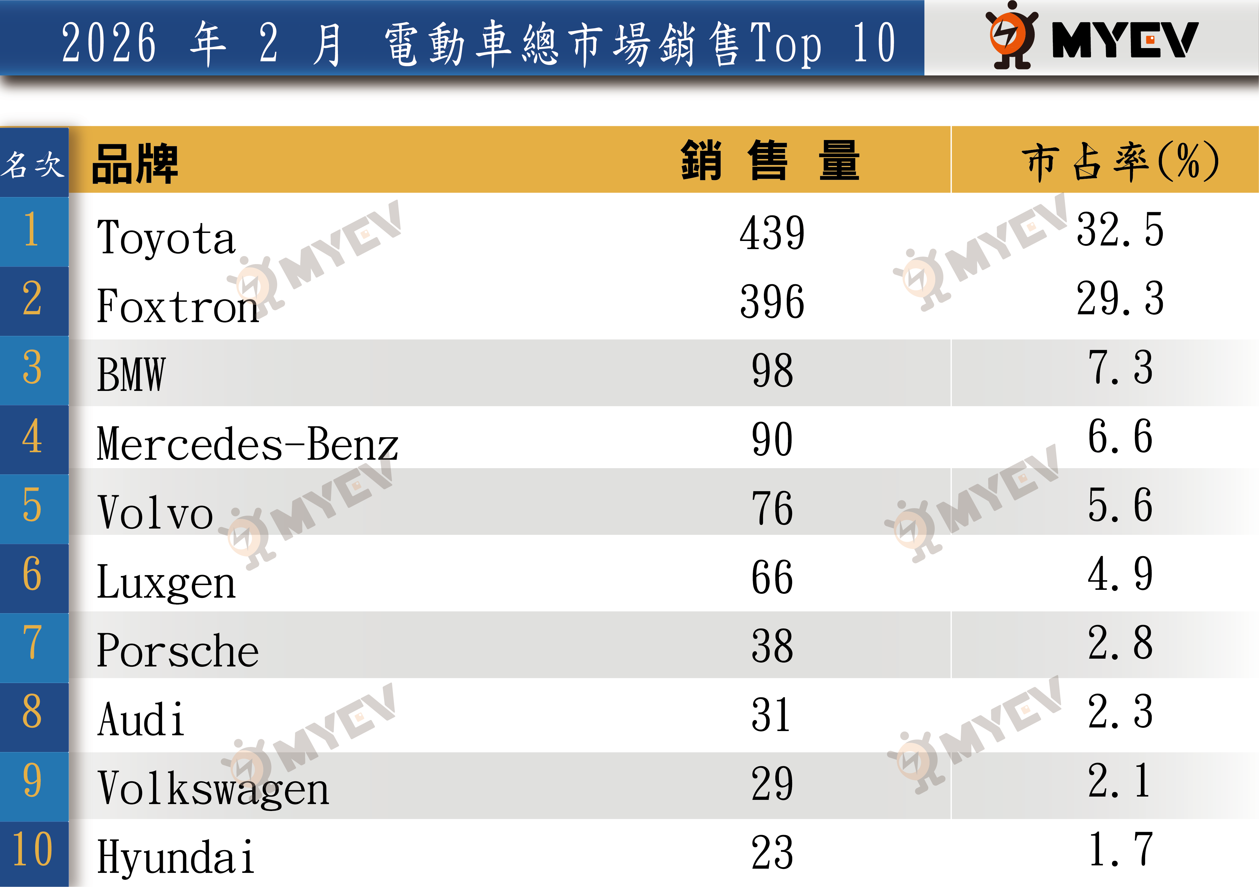 進口品牌方面,Mercedes-Benz單月掛牌1,343輛,較1月僅小幅下滑,排名推升至總市場第3名;Mazda則憑藉CX-5與CX-30穩定輸出,維持前段班位置。整體而言,除長期領先的Toyota外,第2至第6名品牌差距有限,顯示市場集中度持續提升。