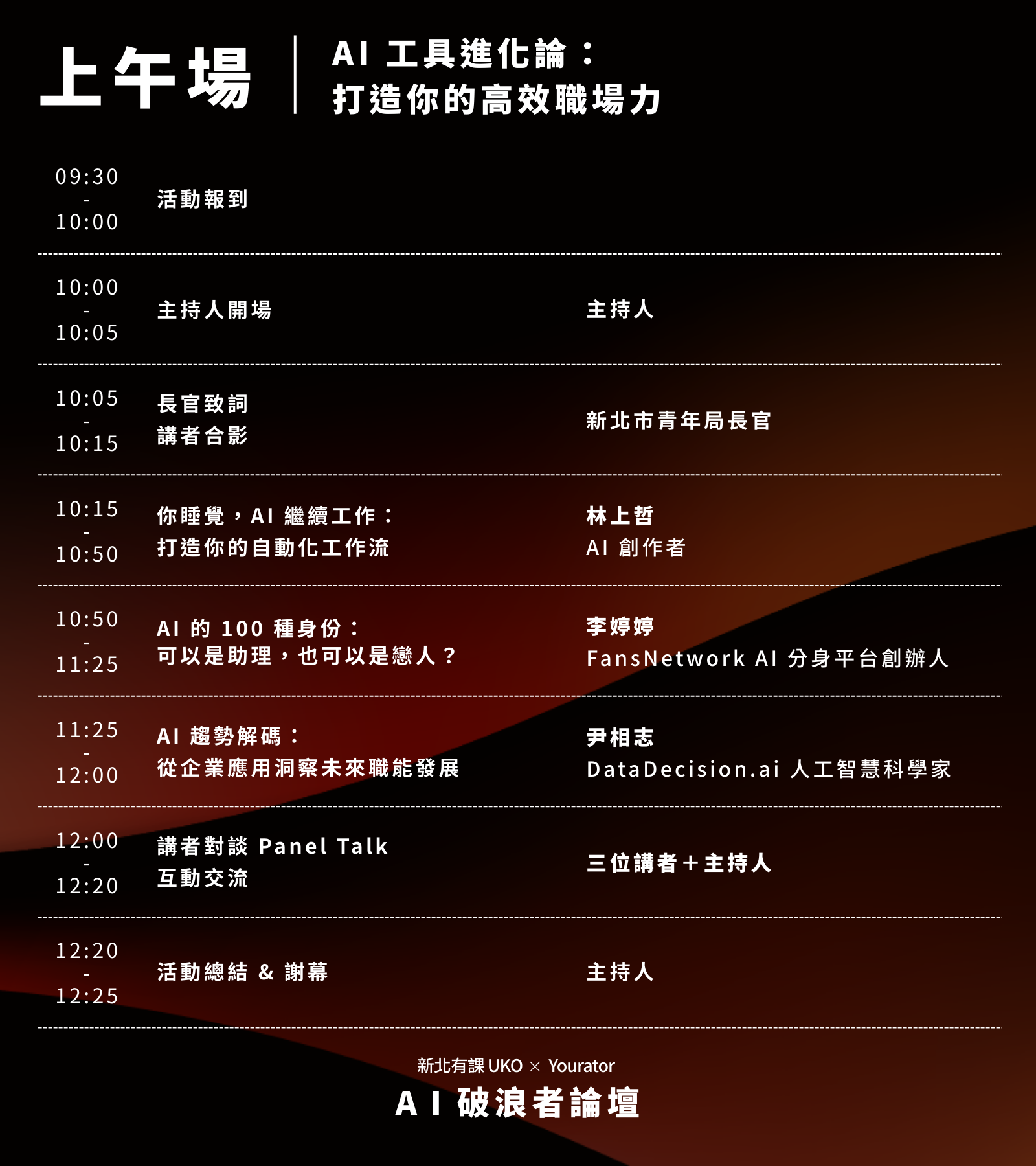 論壇活動上午場聚焦AI應用實戰,邀請AI創作者林上哲分享自學AI與自動化流程的經驗;FansNetwork創辦人李婷婷解析AI如何融入生活與工作,並談及從區塊鏈跨足AI創業的心路歷程;人工智慧科學家尹相志則將以大數據專業,剖析企業導入AI的實務挑戰與未來職能需求。