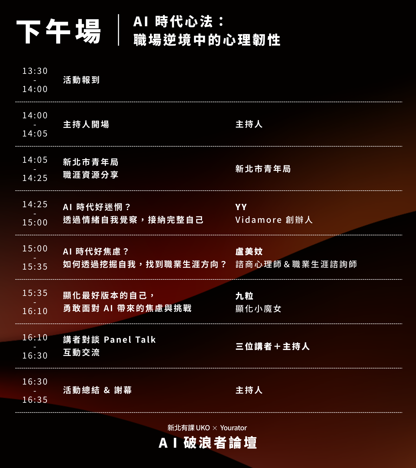下午場則關注心理韌性與職涯心法,Vidamore創辦人YY將談情緒覺察與心理健康推廣,協助青年在不確定中找到自我定位;諮商心理師與職涯顧問盧美妏則引導青年釐清職涯價值與方向;自媒體創作者九粒則分享其演藝與創業歷程,探討如何以正向思維與吸引力法則,面對AI帶來的焦慮與挑戰。